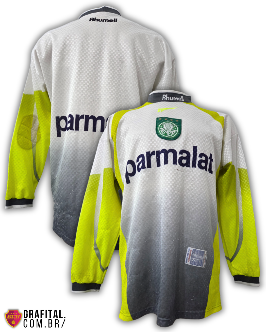 OBS: Raríssima relíquia original histórica eternizada em 99 pelo goleiro São Marcos! Parmalat Rhumell branca e verde limão, muito difícil de encontrar. A camisa contém fios/bolinhas de uso conforme fotos, além de um furinho na frente próximo do Parmalat. Caso queira ver mais fotos favor acesse nosso instagram ou whatsapp.
